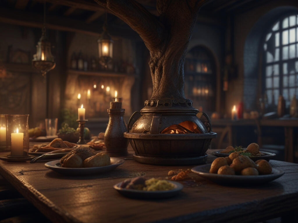 The Thavnair-inspired inn exudes warmth and opulence, inviting guests to relax and unwind in its plush surroundings. Soft lighting and rich textures adorn the space, creating a sense of indulgence and comfort. Plush armchairs and velvet sofas are arranged around coffee tables, perfect for sipping a warm beverage or enjoying a good book. The air is thick with the aroma of freshly brewed coffee, enticing guests to indulge in a cup or two.